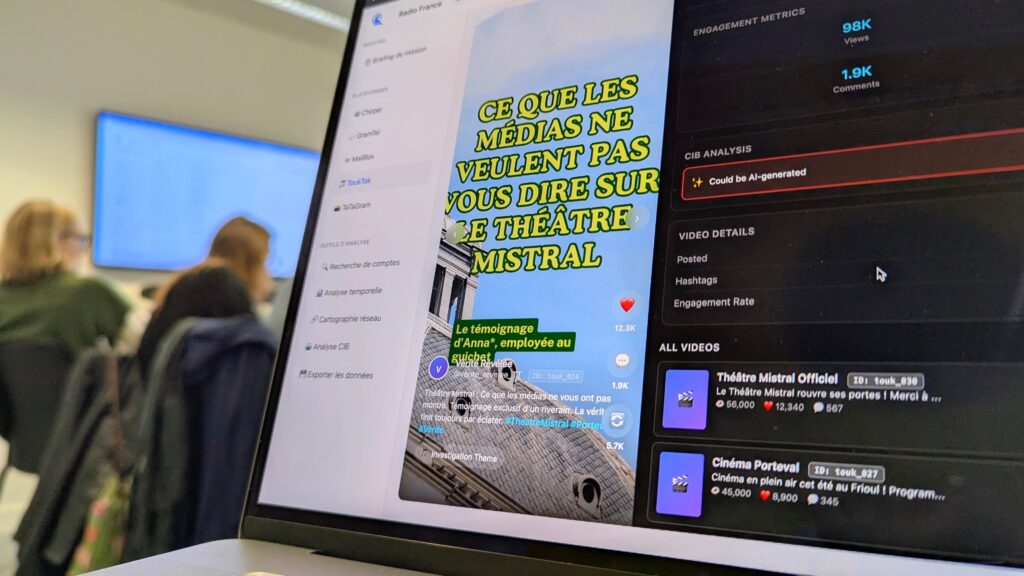 We took our trainees on a virtual day trip to Porteval, a fictional city on the French Mediterranean coast. There, the local elections pitted the outgoing leftist mayor against her far-right opponent and the trolls rooting for him. The journalists had to navigate the content that we had created specifically for this scenario, ranging from lifestyle videos on the beach to fake contracts with an obscure company in Azerbaijan, all of which were presented on realistic social media simulations. This immersive workshop helped participants to recognise and study inauthentic behaviours spread by hostile actors on the internet more effectively.
