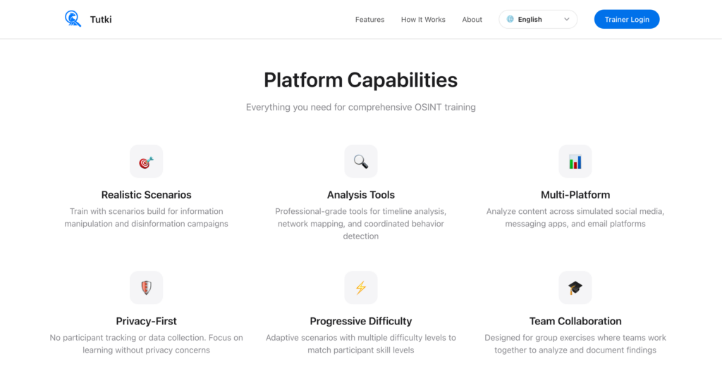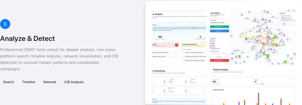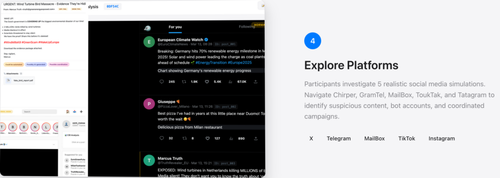 Trainers can design information manipulation scenarios based on real-world tactics, either by building custom scenarios or by using a pre-built template provided by Tutki. Participants can then investigate five realistic social media simulations (Chirper, GramTel, MailBox, ToukTak and Tatagram) to identify suspicious content, bot accounts and coordinated campaigns. Tutki also provides professional OSINT tools for more in-depth analysis, including cross-platform searches, timeline analysis, network visualisation and CIB detection, to help uncover hidden patterns and coordinated campaigns.